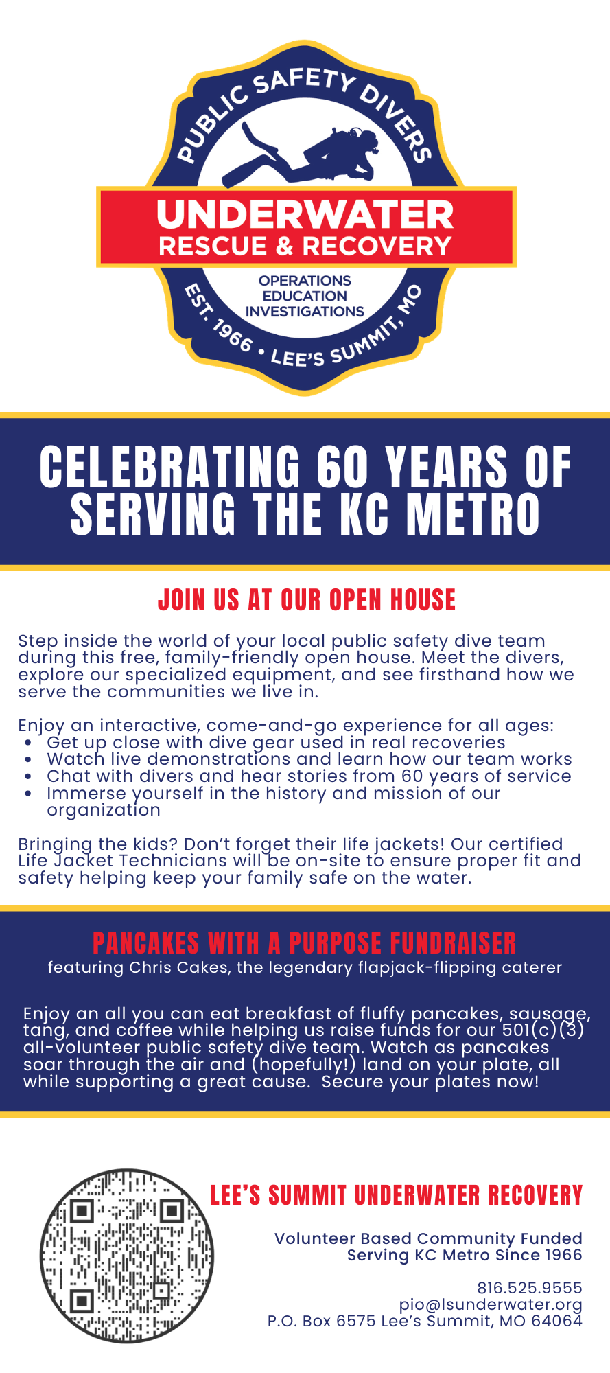 The Lee’s Summit Underwater Rescue and Recovery Team was founded in 1966 to help law enforcement agencies recover drowning victims from area lakes and rivers.